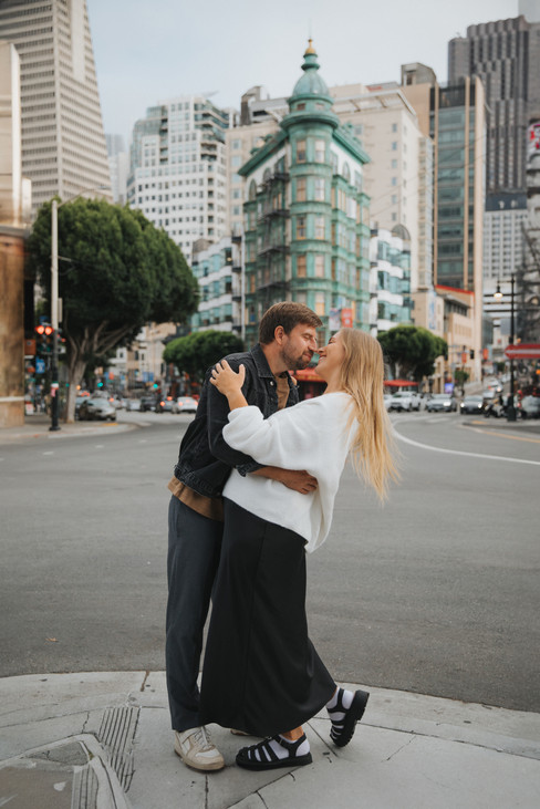 This shoot took place in one of my favorite spots—right where the historic Columbus Tower (the beautiful green building) meets the modern Transamerica Pyramid. It’s such a unique backdrop: a mix of old and new, romance and adventure, history and modern life. Every shot feels alive with the contrast of the bustling city and the quiet connection between two people. 🖤